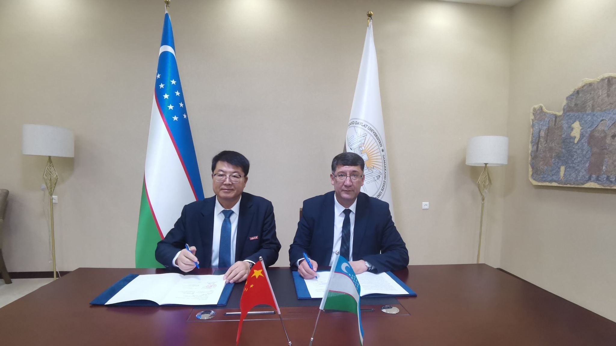 在撒马尔罕国立大学,访问团一行与副校长阿克马尔·阿哈托夫及相关学院负责人举行会谈,共同签署了两校合作框架协议。双方就建立常态化合作机制、学生联合培养、教师互访、共建国际科研平台及策划“丝绸之路文化青年对话夏令营”等方面的务实合作进行交流。